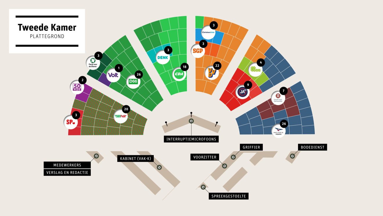 Bekijk de zetelverdeling van de Tweede Kamer en de plekken van de partijen. Ook enkele andere belangrijke plekken in de plenaire zaal worden uitgelicht.